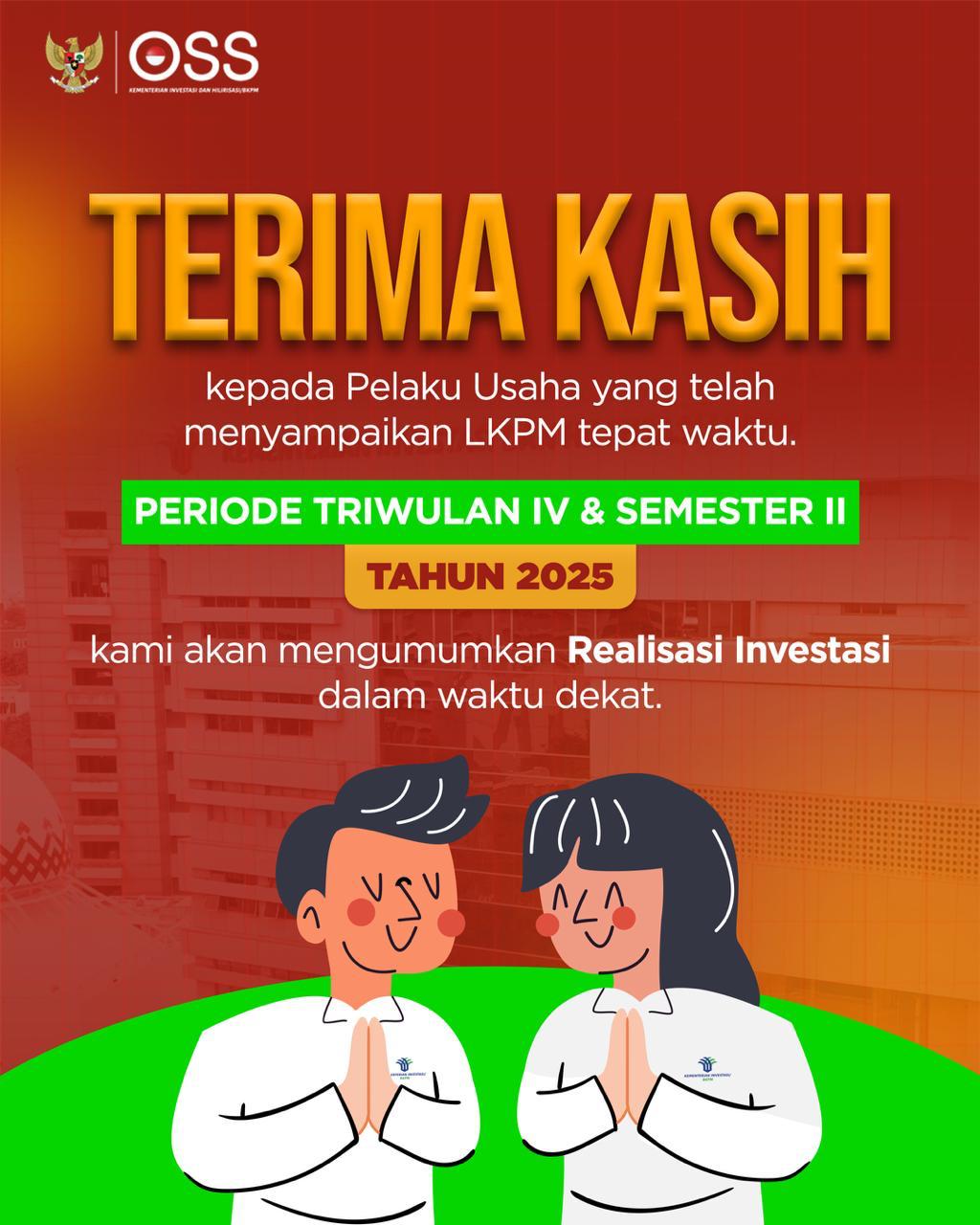 "Terima kasih atas kerja sama Bapak/Ibu Pelaku Usaha yang telah menyampaikan LKPM tepat waktu . Kepatuhan Anda sangat membantu kami dalam pendataan realisasi investasi. Mari terus pertahankan!"