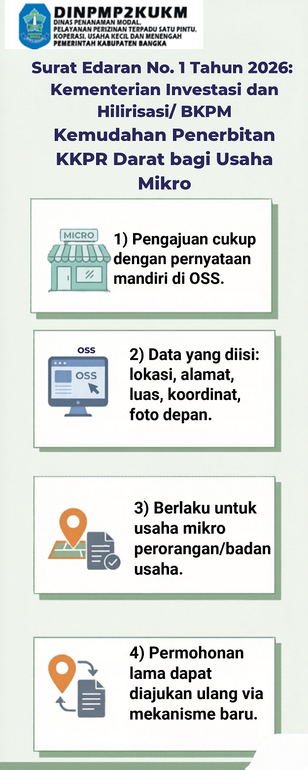 Kementerian Investasi dan Hilirisasi/Badan Koordinasi Penanaman Modal (BKPM) menerbitkan Surat Edaran Nomor 1 Tahun 2026 tentang Ketentuan Penerbitan Kesesuaian Kegiatan Pemanfaatan Ruang (KKPR) Darat bagi Usaha Mikro sebagai langkah konkret memberikan kemudahan berusaha bagi pelaku usaha mikro.
